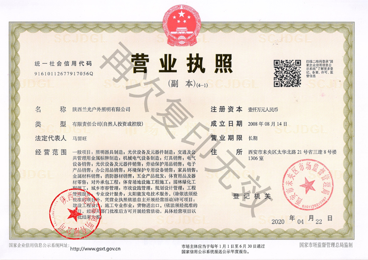 陜西蘭光戶外照明有限公司 營(yíng)業(yè)執(zhí)照